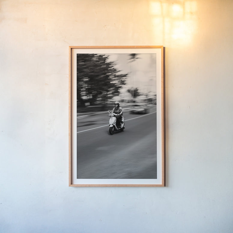 A Bermudian rider cuts through the street on a scooter, the world blurring around them in a rush of palms, pavement, and traffic. It’s a familiar sight on the island — fast, effortless, and unapologetically practical. The motion in the frame tells the real story: life here moves quickly when it needs to, but never loses its sense of rhythm.