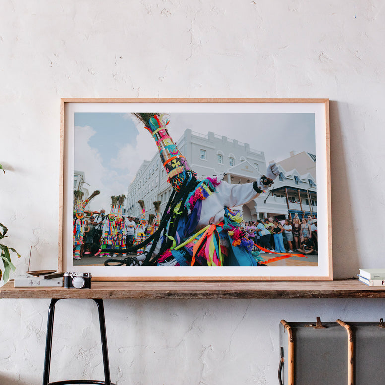 Captured in the heart of Hamilton, this image shows the Bermudian Gombeys in full color and motion — masks, ribbons, drums, and layered tradition. The crowd presses in, the dancers take the street, and the energy becomes impossible to ignore. It’s loud, joyful, and rooted in history, honoring a culture passed down through families who know the rhythm by heart.