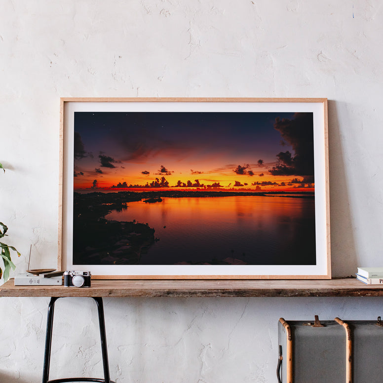 The sun slips below the horizon, leaving the sky burning in reds and deep oranges that reflect across the still harbor. The water glows as the last light of the day settles in, pulling the world into a softer, quieter place. It’s the kind of sunset you don’t talk through — you just watch, breathe, and let it take over for a moment.