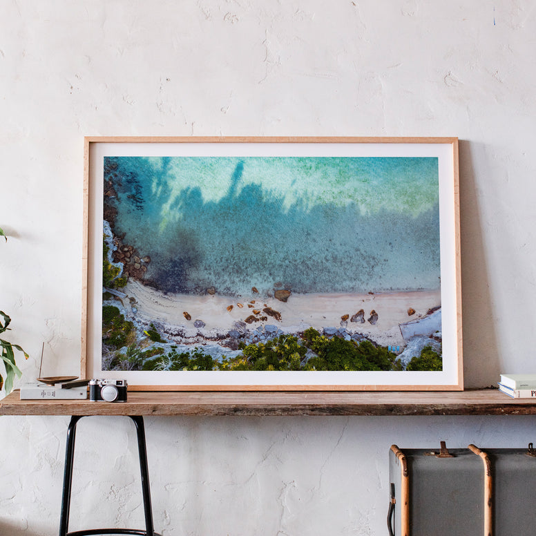 An aerial view of a quiet Bermudian shoreline, where turquoise water fades into pale sand and scattered rock. The trees cast long shadows across the sea, giving the cove depth and texture from above. It’s the kind of place you stumble across while exploring — hidden, calm, and shaped perfectly by wind, tide, and time.